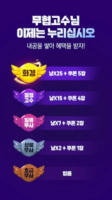 강툰에서는 독서의 즐거움이 곧 보상으로 이어집니다. 매일 새롭게 주어지는 일일 미션부터 예측 불가능한 깜짝 특별 미션까지, 만화를 감상하는 것만으로 '보너스 냥'이 차곡차곡 쌓입니다. 여기에서 그치지 않고, 강툰만의 독창적인 '무공 회원등급' 시스템으로 당신의 충성도를 인정합니다. 초급무사부터 화경에 이르는 다섯 등급을 통해 작품 대여, 리뷰 작성, 충전 등으로 '내공'을 쌓고, 등급에 따른 추가 '보너스 냥'과 특별 쿠폰 혜택을 마음껏 누리세요.