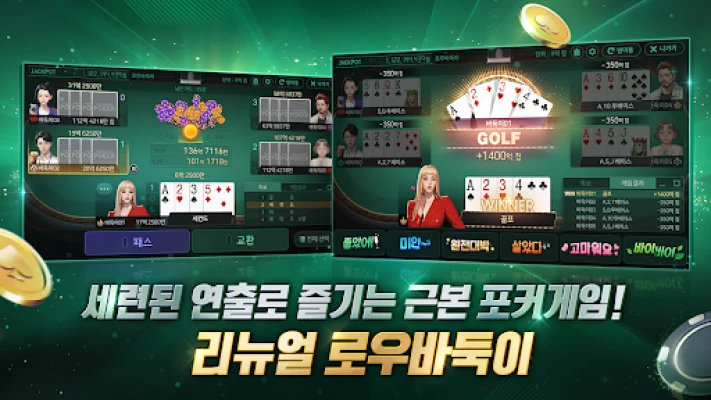 포커를 넘어 카지노의 열기가 가득한 현장감을 찾으신다면, 한게임포커가 정답입니다. 최대 7인이 함께 즐기는 바카라, 전략적인 묘미의 블랙잭, 주사위의 행운을 점치는 다이사이, 그리고 5인 멀티플레이로 긴장감을 더하는 룰렛까지, 실제 카지노를 그대로 옮겨 놓은 듯한 고품격 게임들을 만날 수 있습니다. 잭팟 슬롯, 빅휠, 빅팟 스크래치 등 다채로운 미니 게임들은 여러분의 라스베이거스 꿈을 현실로 만들어 드립니다. 매일 주어지는 무료 잭팟 슬롯 머신 기회를 놓치지 마세요.